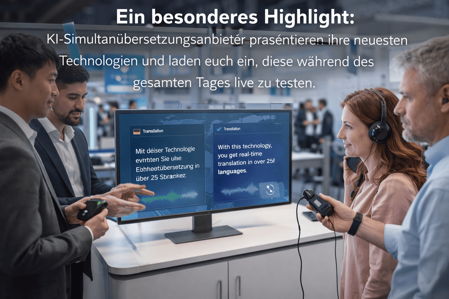 Ein besonderes Highlight des Tages: Anbieter für KI-Simultanübersetzung präsentieren ihre neuesten Technologien und laden euch ein, diese während des gesamten Tages live zu testen.